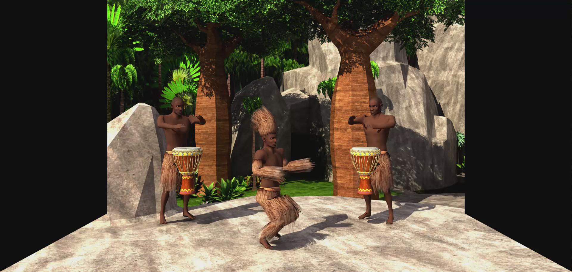 坎科冉是塞內加爾和岡比亞的曼丁人地區(qū)的一種成年禮,相當于“卡薩曼斯”(Casamance)。坎科冉儀式主要的特征是:受成年禮者帶著用樹皮和faara樹的紅根須做成的面具,穿著樹葉做成的衣服,用蔬菜漿汁涂畫全身。該影片利用三維動畫形象描述了坎科冉或曼丁成人禮的效果,體現(xiàn)了曼丁的文化特性,立體效果強烈。